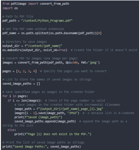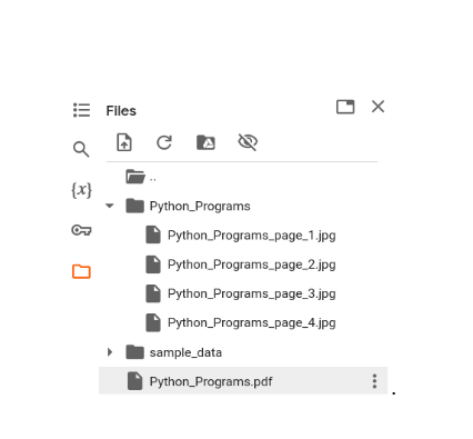 Here we first extract the PDF’s name and create a folder in the specified directory (/content/Python_Programs). After converting the PDF into images (one per page), it saves the specified pages (e.g., pages 1, 2, 3, and 4) as .jpg files within the newly created folder. Each image is saved with a filename indicating the original PDF name and page number (e.g., Python_Programs_page_1.jpg). This approach provides a structured output, organizing each page’s image into a single folder with descriptive filenames, making it easy to identify and retrieve individual page images. Thus our output in the folder structure would look like this.