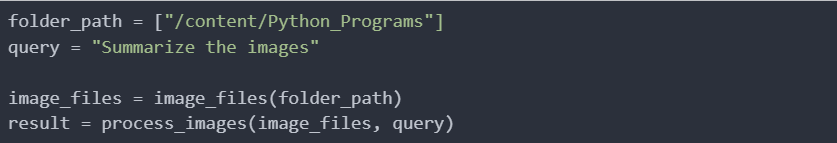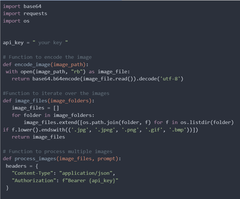 First, the encode_image function reads an image file in binary mode, encodes it in base64, and returns the encoded string, which is essential for embedding images directly in JSON requests. Next, the image_files function takes a list of folder paths, iterates through each folder, and collects all image file paths with specific extensions (.jpg, .jpeg, .png, .gif, and .bmp), returning a flat list of these paths.