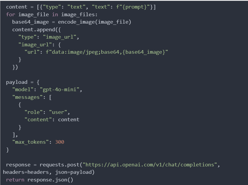 Finally, the process_images function accepts the list of image file paths and a text prompt, sets the request headers, initializes the message content with the prompt, adds each image as a base64-encoded string, and constructs a payload dictionary that specifies the model to be used, the user role, and the assembled message content for sending to the OpenAI API.